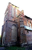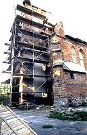 Der eingerüstete Kirchturm der Arnauer Katharinenkirche. Seit Mitte der neunziger Jahre werden Restaurierungsarbeiten vom Zentrum für Denkmalsschutz in Zusammenarbeit mit dem deutschen Kuratorium Arnau e.V. Hamburg zum Erhalt der Kirche durchgeführt. Sept. 1999 CD03035