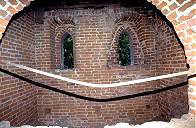Die ehemalige Wallfahrtskirche, der Heiligen Katharina geweiht, liegt auf einem Hügel oberhalb des Pregels. Bis in die neunziger Jahre wurde sie von der örtlichen Kolchose als Lagerhalle genutzt. Okt. 1995 CD03014