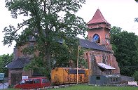 Der eingerüstete Kirchturm der Arnauer Katharinenkirche. Seit Mitte der neunziger Jahre werden Restaurierungsarbeiten vom Zentrum für Denkmalsschutz in Zusammenarbeit mit dem deutschen Kuratorium Arnau e.V. Hamburg zum Erhalt der Kirche durchgeführt. Sept. 1999 CD03034