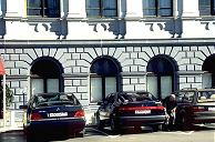 altes Mütterchen wäscht vor der ehemaligen Börse die Limousinen der